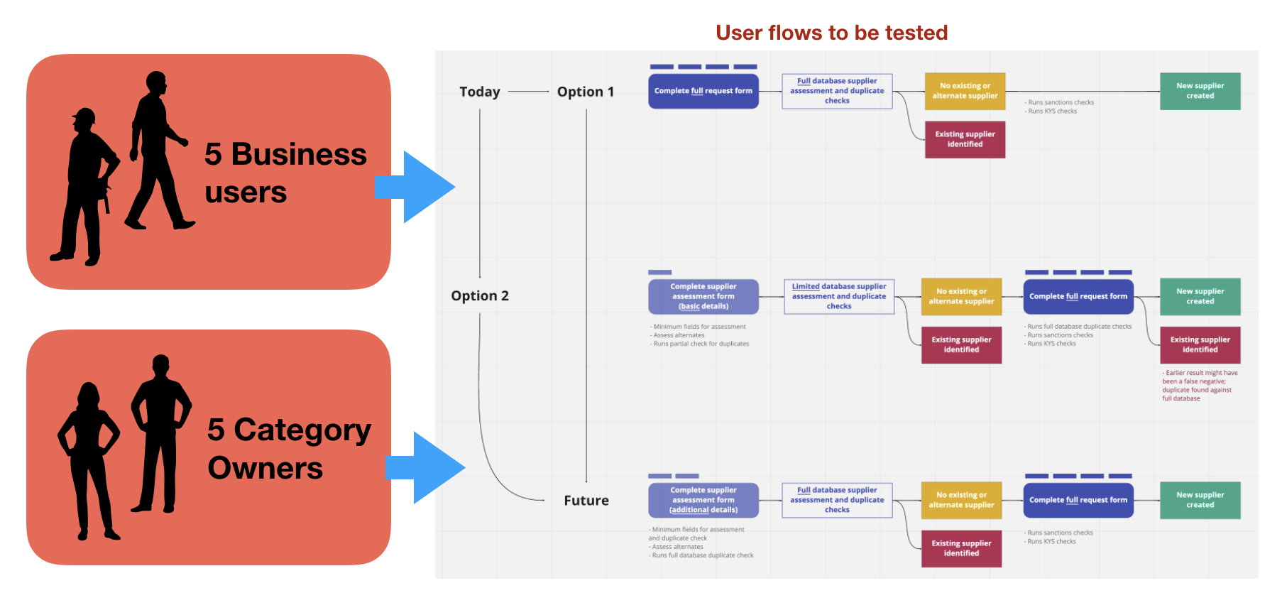 We plotted 3 potential user flows, which were derived by the existing draft of the future supplier creation process. These flows were to be tested with 2 main user groups, which were the business users and category owners.