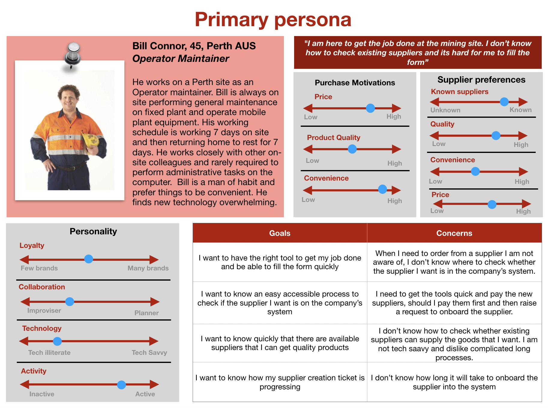 Prior to redesigning the future state process of supplier creation, it was essential to communicate who we believed the target users are and define them into personas for our key stakeholders. By explaining the personality traits and attributes of these users, it brought our key stakeholders closer to who we were trying to focus on to solve the inefficiency of the current process. Also, guide them to understand what solutions are the most effective for those user groups.