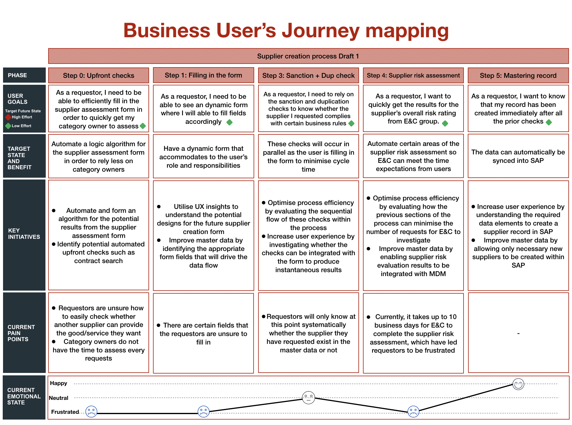 In an effort to increase regulatory and stakeholder expectations in 3rd party engagement practices, our client wanted my team and I to improve their supplier creation and management approach in their E2E supplier onboarding process. Ultimately, wanting a balance between process efficiency, procurement governance and user experience.