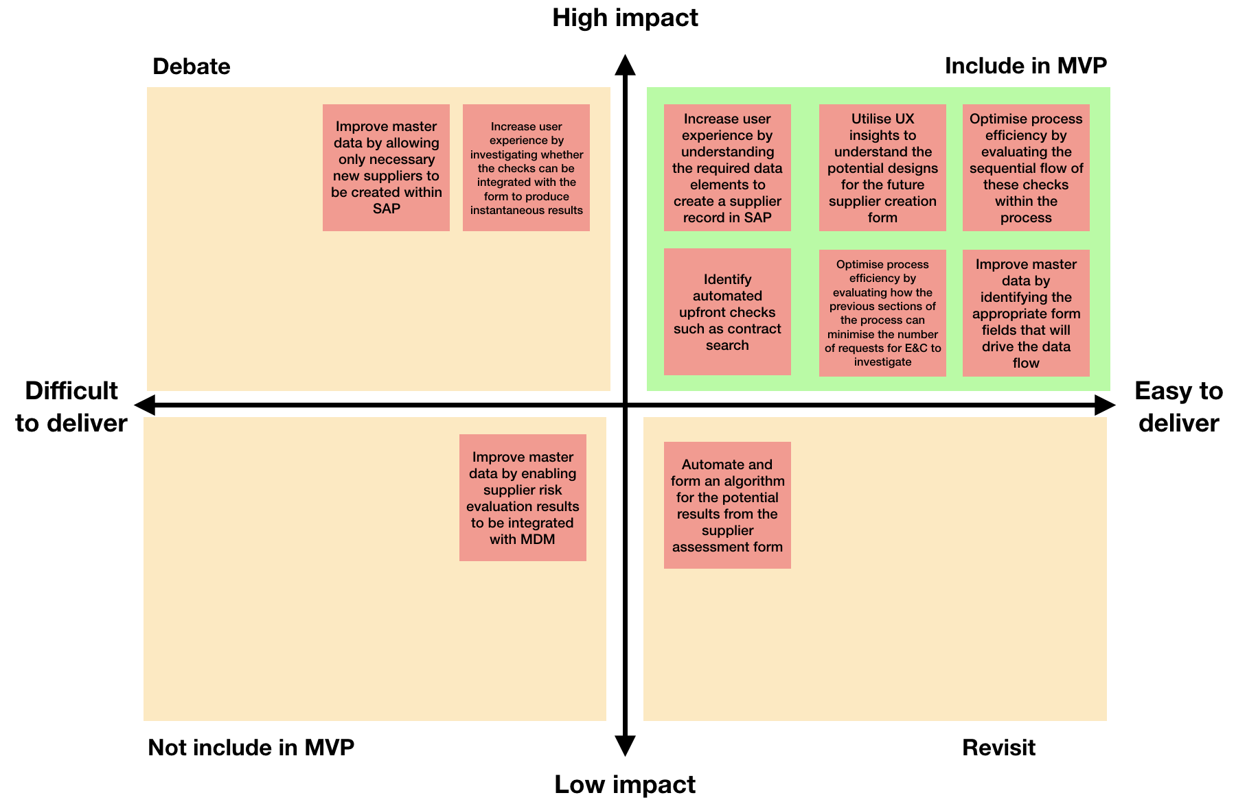 Upon presenting the personas and user journey mapping to our key stakeholders, my team and I performed an exercise via virtual white-boarding on Miro to allow and our stakeholders to agree upon which key initiatives from the user journey mapping are the most impactful and easiest to deliver for the MVP state.